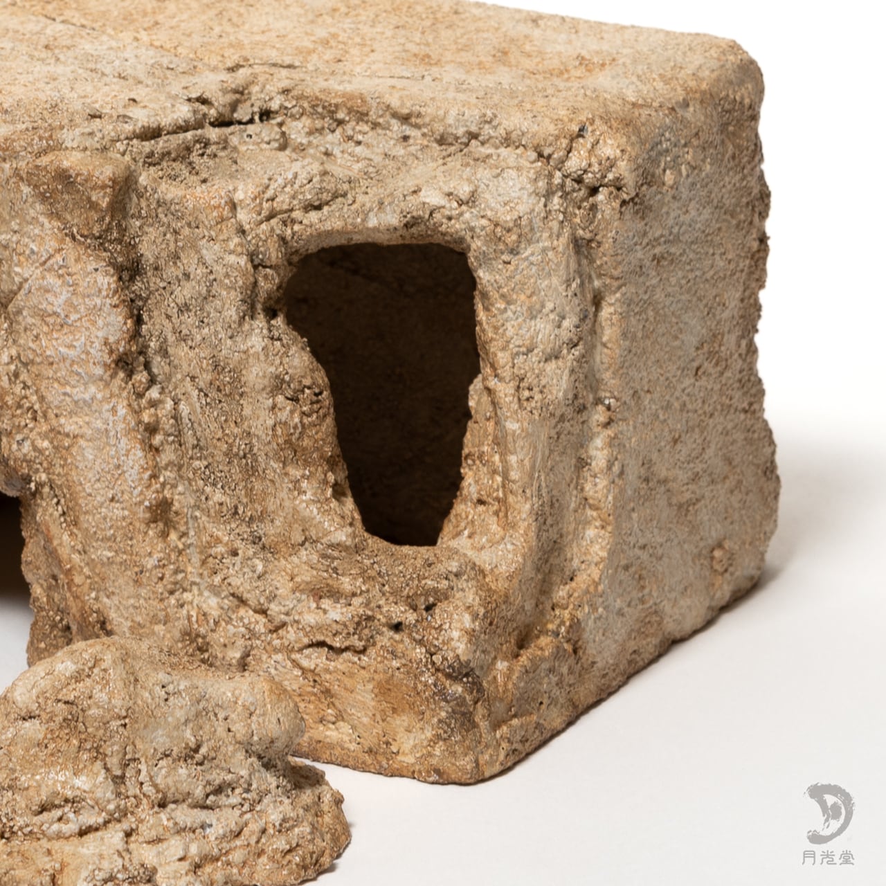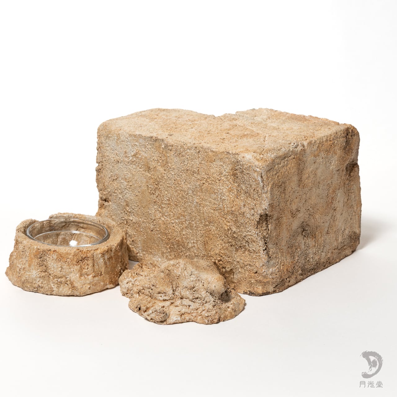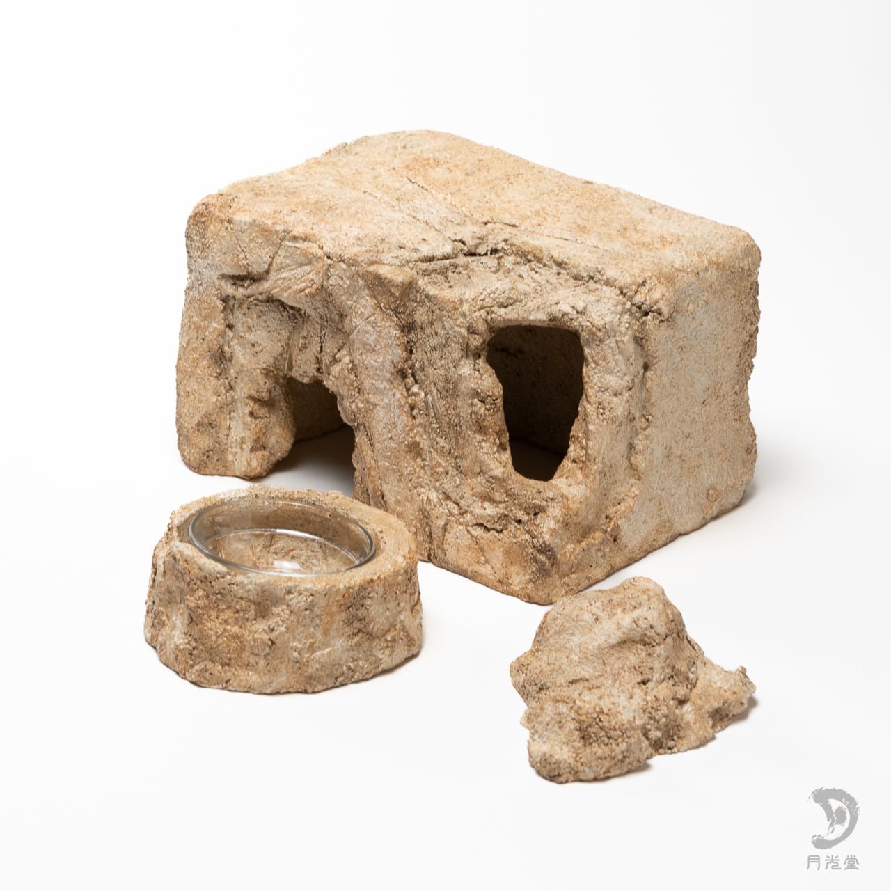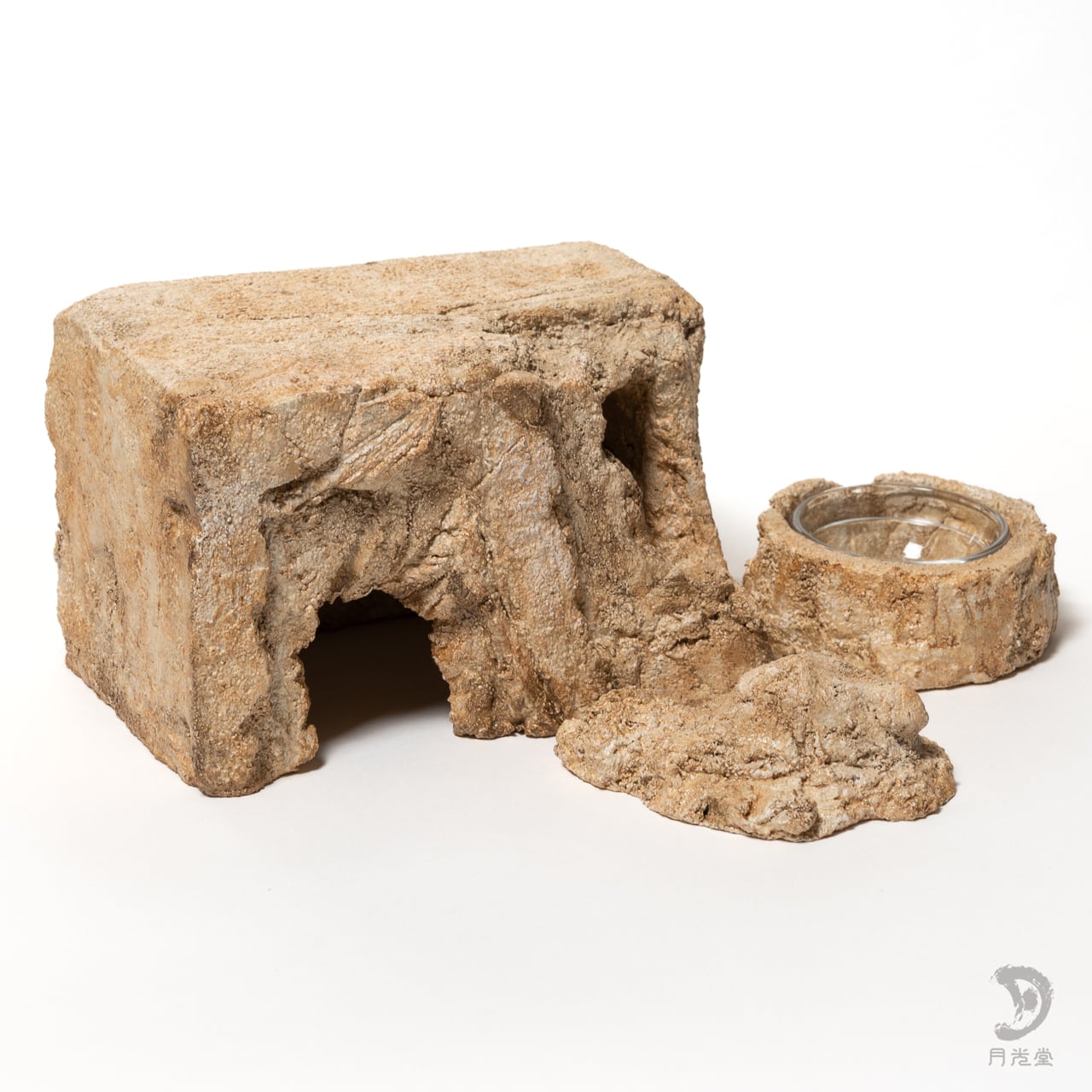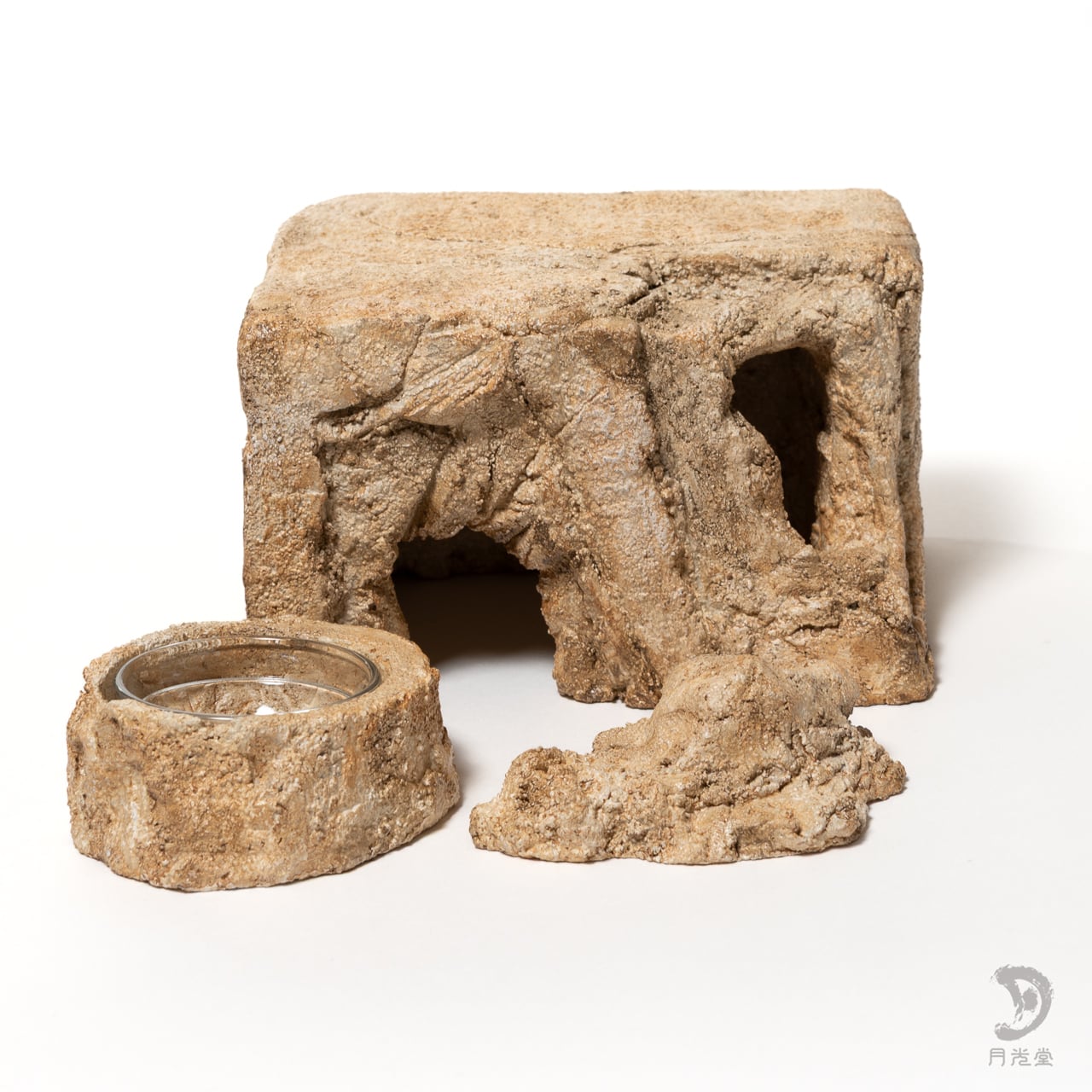 爬虫類シェルター|廃墟シェルター 水入れ レイアウトロック付き 砂岩カラー」|レプタイルボックスに入るサイズ|月光堂 2604-hk